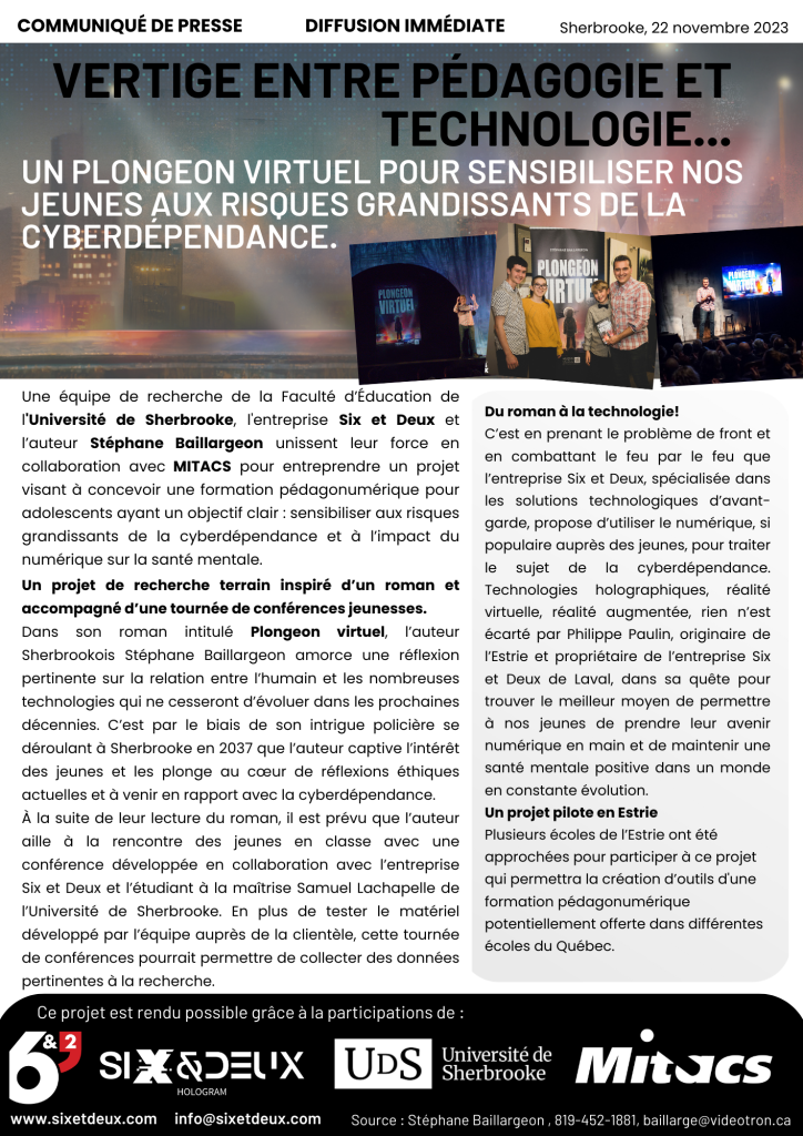 Plongeon Virtuel est son premier roman et met à profit son expérience acquise au sein de l’équipe de Six et Deux.
